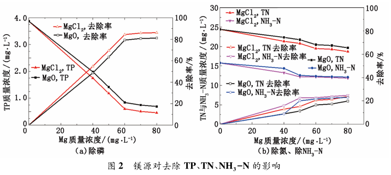 在 NaOH 投加量為 150 mg / L,污水 TP、TN 和NH3 -N 質量濃度分別為 3. 87、24. 41 和 15. 76 mg / L 條件下進行實驗,結果見圖 2。圖 2 看出,隨鎂源投加量的增加,污水 TP 的質量濃度逐漸降低,去除率在投加量為 60 mg / L 時基本不變; TN 質量濃度隨投加量的增加逐漸降低,去除率逐漸升高; NH3 - N 呈降低趨勢,去除率在投加量超過 60 mg / L 不再變化。出現該現象的原因是鎂源的增多對污水除磷脫氮起促進作用。當 Mg2+質量濃度達到一定,晶粒逐漸產生,沉淀反應正向進行。在一定的 TN、TP 質量濃度下,當 PO4 、NH4與 Mg2+ 的離子活度積大于 MAP 的濃度積時,晶體成核發生,因離子在晶核表面沉淀的活化能較成核 所需活化能更低,晶體生長速率更快,晶體開始生長。溶液中的鎂離子質量濃度越高,平衡向沉淀產生方向移動,反應接近完全,TP 的去除作用越明顯;當鎂源投加量為 60 mg / L 時,磷酸銨鎂微溶于水,此時PO4 、NH4 與 Mg 質量濃度達到該溫度下的沉淀平衡,但過量增大鎂鹽投加量會使溶液中 Mg2+ 和PO4 發生副反應生成 Mg3 ( PO4 ) 2 的趨勢增大,從而使氨氮的脫除效果降低。繼續投加鎂源,除磷脫氮效率無顯著增加。MgCl2 與 MgO 對比之后可以發現,前者的效果要優于后者,由于所處理污水原水pH 值為 7. 84,呈弱堿性,且 MgO 在堿性環境下溶解度小,在沉淀反應開始前未完全溶解,生成的 MAP沉積在未溶解的 MgO 表面,導致部分 MgO 被 MAP包裹在內部而無法與溶液充分接觸,使反應不完全,因此 MgO 對于除磷脫氮的作用有限[11]。基于對成本和 藥 劑 需 求 量 考 慮,以 NaOH 質 量 濃 度 為 150 mg / L,MgCl2 質量濃度為 60 mg / L 為最佳投藥量。