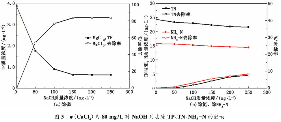 ( 1) 使用鈣鎂復配藥劑對高氮磷含量污水的除磷脫氮實驗中,NaOH、MgCl2和 CaCl2的質量濃度分別為 150、60 和 40 mg / L 時,TP 去除率達到 90%,TN 和 NH3 -N 去除率達到 25%。