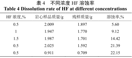 滲透砂巖地層巖心粉末,HF 溶液濃度分別為0.5%、1.0%、1.5%、2.0%、2.5%,以各種不同濃度的 HF 溶液分別迚行以上實驗,得到如下所示的實驗效果(表 4)。