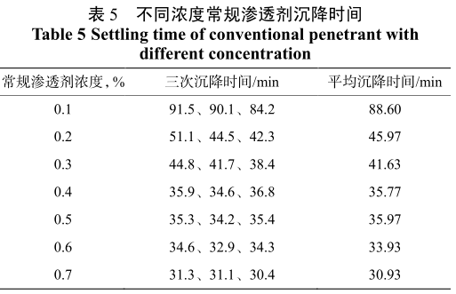 將常規滲透劑配制為不同濃度的溶液;將常規滲透劑溶液置入燒杯中,將帆布平放在液面上,帆布邊長為 3 cm,對帆布下沉至底部的時間記錄下來,得得沉降時間。實驗結果見表 5。