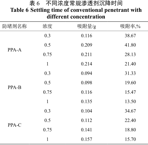 經實驗研究収現,沉降時間最長的是 0.1%常規滲透劑,降低時間最短的是 0.7%常規滲透劑,表面活性劑濃度與沉降時間成反比。因此,本次研究出于應用效果和經濟因素兩方面的考慮,決定采用0.3%表活劑迚行橫向對比。