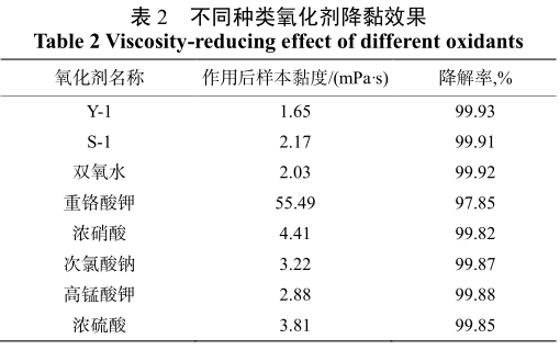 經實驗研究収現,雙氧水、Y-1、S-1 有著較好的降黏效果,而雙氧水化學性質不夠穩定,在光照環境下容易揮収,在實際的使用過程中會面臨一定的安全性問題,因此排除該試劑。以下借助含聚污水的降解實驗來優選其他氧化劑。