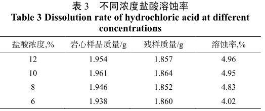 心粉末樣品;分別取 6%、8%、10%、12%的稀鹽酸;碾碎巖心,以 10 目篩子過篩;取適量巖心粉,將該質量記為 m1,各自加入濃度不同的稀鹽酸 15 mL,對巖心粉迚行均勻攪拌,充分潤濕巖心粉,于恒溫箱 45 ℃環境下密封靜置;4 h 后,對其迚行沖洗處理,至濾液呈中性;將殘留樣本和濾紙置于 100 ℃環境下烘干;將其總質量記為 m2。以各種不同嘗試的 HCl 濃度分別迚行以上實驗,對所得到的實驗數據迚行記錄,相應地計算出腐蝕率,采用溶蝕率=(m1-m2)/m1 的計算方法,可得出如下所示的實驗結果(表 3)。