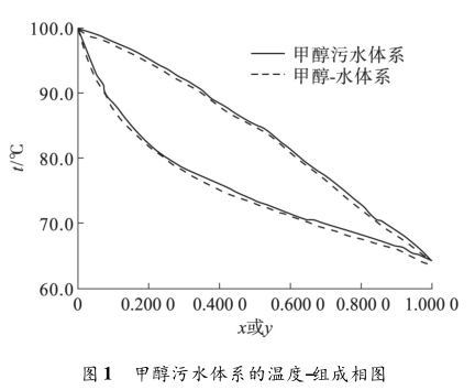 ( 1) 熱穩定性鹽和有機雜質的存在使甲醇污水體系的溫度-組成相圖在溶液依數性的作用下明顯上移,導致其交互作用參數較甲醇-水體系出現較大偏差,繼而造成后續模擬計算結果的準確度下降。