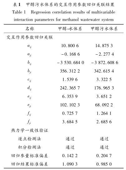由表 1 可知,甲醇污水體系交互作用參數和甲醇-水體系交互作用參數兩者之間存在顯著差異,經回歸關聯得到的甲醇污水體系交互作用參數可順利通過熱力學一致性驗證,其回歸參量標準偏差、回歸結果標準偏差分別僅為 0. 204 7 和 0. 985 0,遠遠小于規定值,可滿足后續模擬優化的準確度要求。