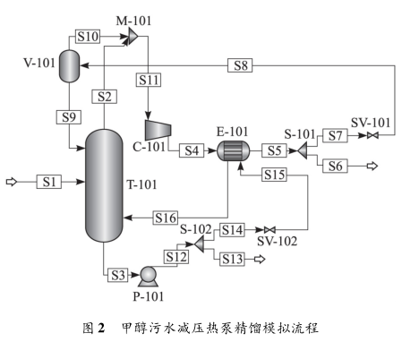 預處理后的甲醇污水由甲醇精餾塔( T-101) 中部進料,塔頂的低壓蒸汽進入壓縮機( C-101) 進行加壓升溫作為塔底再沸器( E-101) 的熱源,經換熱后自身冷凝為液態,一部分作為甲醇產品,另一部分經節流后進入塔頂氣液分離罐( V-101 ) ,氣相循環回 C-101 進口,液相作為塔頂回流入塔。塔底的一部分廢水與塔頂的高溫高壓甲醇蒸汽在 E-101 中換熱后氣化作為塔底氣相回流,另一部分廢水直接出裝置,如圖 2 所示。