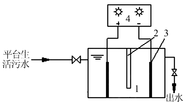 試驗用水為南海某平臺生活污水,為黑水和灰水混合物。 黑水主要是沖廁水,含有大腸桿菌;灰水包括廚房廢水、洗衣廢水及洗澡廢水, 含有大量油污和難降解的表面活性劑。 其水質為 COD 500~800 mg/L,pH 6.5~9.5,電導率 2 000~4 000 μS/cm。 為調節電導率須同步添加海水,海水取自該平臺所處海域。儀器:PB-10 型標準 pH 計,賽多利斯;HH-6 型化學耗氧量測定儀、DR800 便攜式分光光度計,美國哈希;DHG-9240A 恒溫干燥箱, 上海博訊事業有限公司。 ECO 反應器和 PECO 反應器均為自制。
