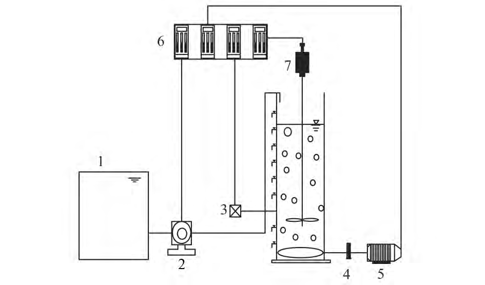 1. 進水箱; 2. 蠕動泵; 3. 出水; 4. 氣體流量計; 5. 鼓風機 6. 進水、出水、攪拌、曝氣時序控制器; 7. 攪拌機