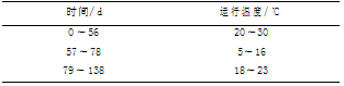 反應(yīng)器每天運行 4 個周期,每個周期 6 h,分為: 進水 10 min,厭氧 80 min,好氧 210 min,沉淀 ( 30 ~ 3) min( 沉淀時間在顆粒培養(yǎng)階段逐漸由 30min 遞減至 3 min,顆粒成熟之后保持 3 min) ,排水 10 min,剩余時間閑置,反應(yīng)器換水比為 75% . 運行過程中對 pH 不做控制,控制曝氣流量為 1. 50L·min - 1 ,運行溫度變化如表 1 所示.