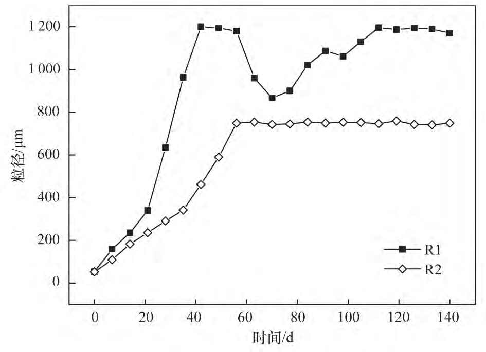 R1、R2 分別以人工配水和實際生活污水為進水,接種污水處理廠普通絮狀活性污泥,采取逐漸縮短沉淀時間的方式培養(yǎng)好氧顆粒污泥. R1、R2分別在第 20 d、35 d 時,出現(xiàn)細小顆粒,如圖 2 所示,分別歷時 25 d、42 d 后,顆粒污泥的平均粒徑達到 340 μm,好氧顆粒污泥工藝啟動成功. 顆粒污泥穩(wěn)定后,其平均粒徑分別達到1 200 μm、750μm. 有研究表明進水有機負荷是好氧顆粒污泥形成的重要影響因素,有機負荷較低,微生物生長速率減慢,不利于顆粒化. 人工配水中的有機物易被微生物吸收利用,而實際生活污水水質(zhì)成分復雜,由易生物降解物質(zhì)、慢速生物降解物質(zhì)和溶解性惰性物質(zhì)組成,其中,溶解性惰性物質(zhì)包含不可生物降解的 COD 組分,生活污水中能被微生物利用的有機負荷較人工配水少,故 R2 相對R1 污