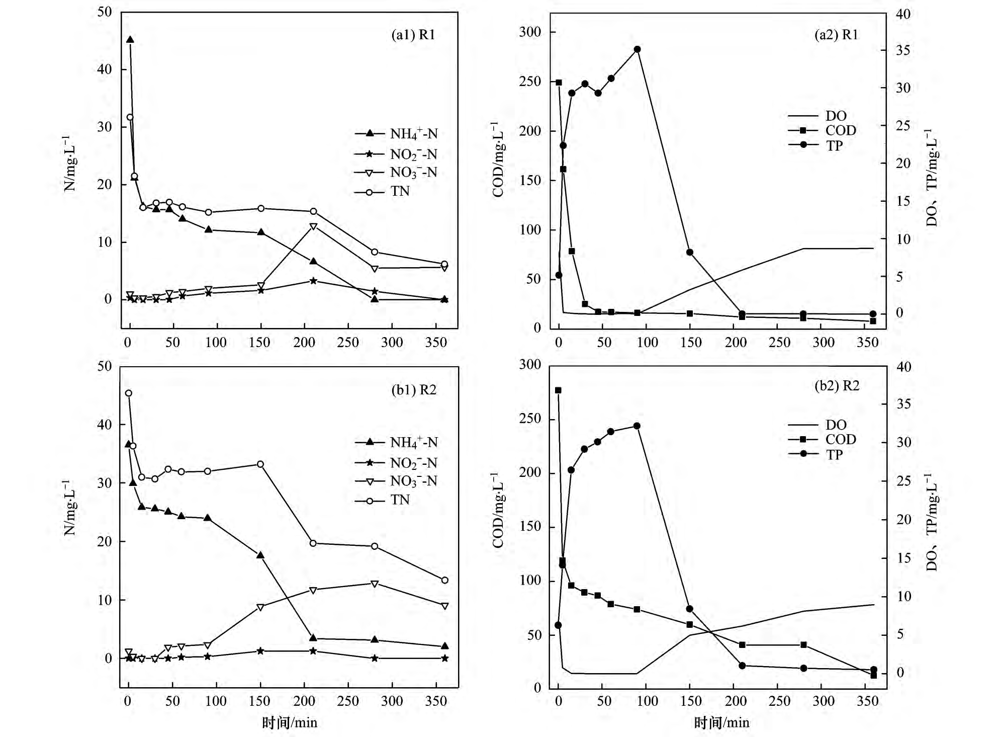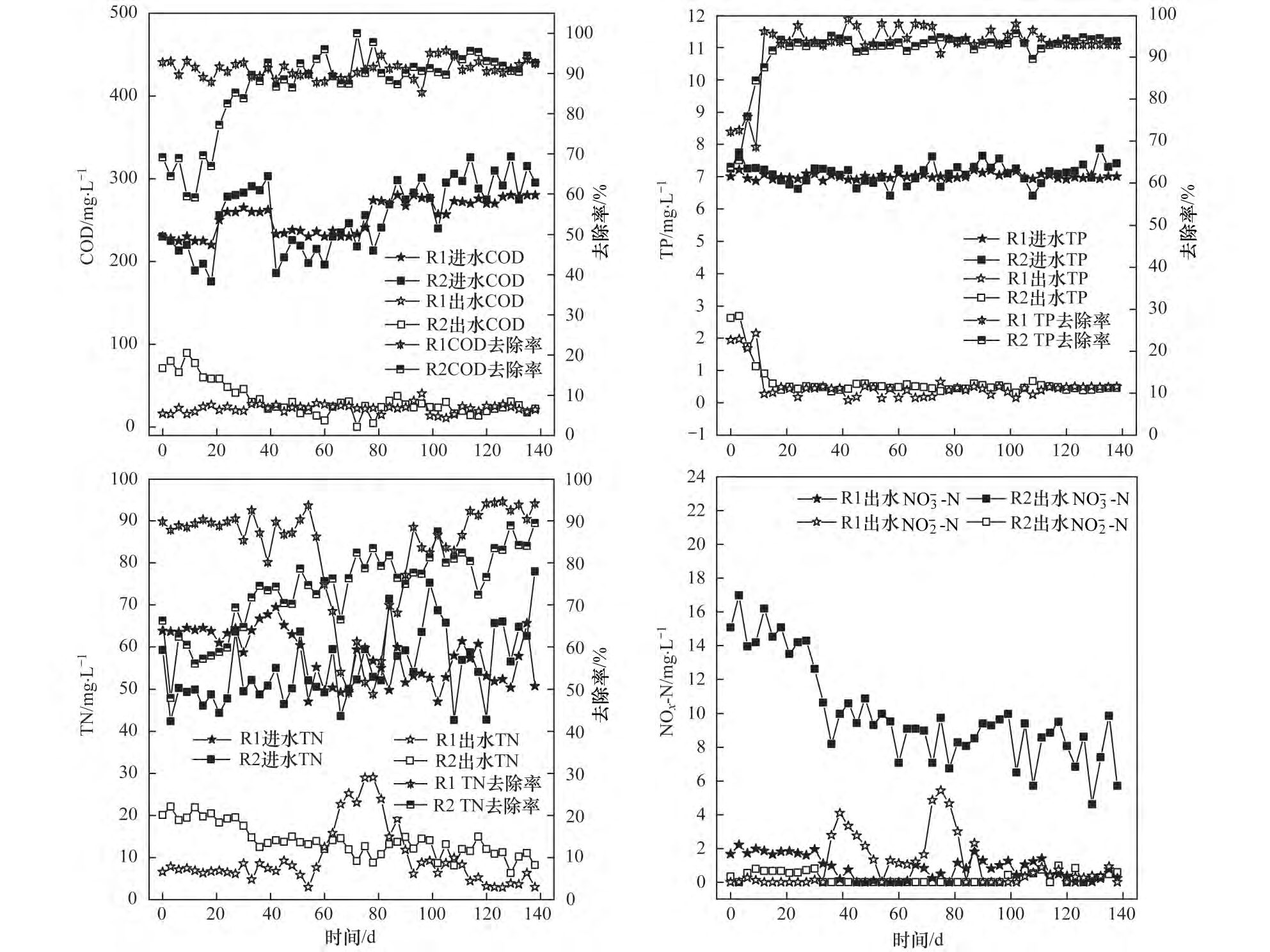 圖 5 R1 和 R2 反應(yīng)器去除 COD、TP、TN 和 NO - -N 的性能