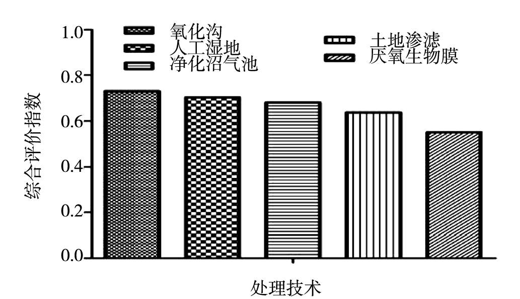 新疆地區(qū)經(jīng)濟(jì)發(fā)展不平穩(wěn),各地州氣候差異顯著,在選擇污水處理工藝時(shí)應(yīng)結(jié)合當(dāng)?shù)刈匀画h(huán)境、管理水平和經(jīng)濟(jì)條件等因素,優(yōu)先選擇處理率高、運(yùn)行成本低的污水治理技術(shù)。呂任生等人通過(guò)研究發(fā)現(xiàn),人工濕地、土壤滲濾及凈化沼氣池的工藝綜合性能評(píng)價(jià)結(jié)果明顯優(yōu)于化糞池和生物穩(wěn)定塘等技術(shù)。