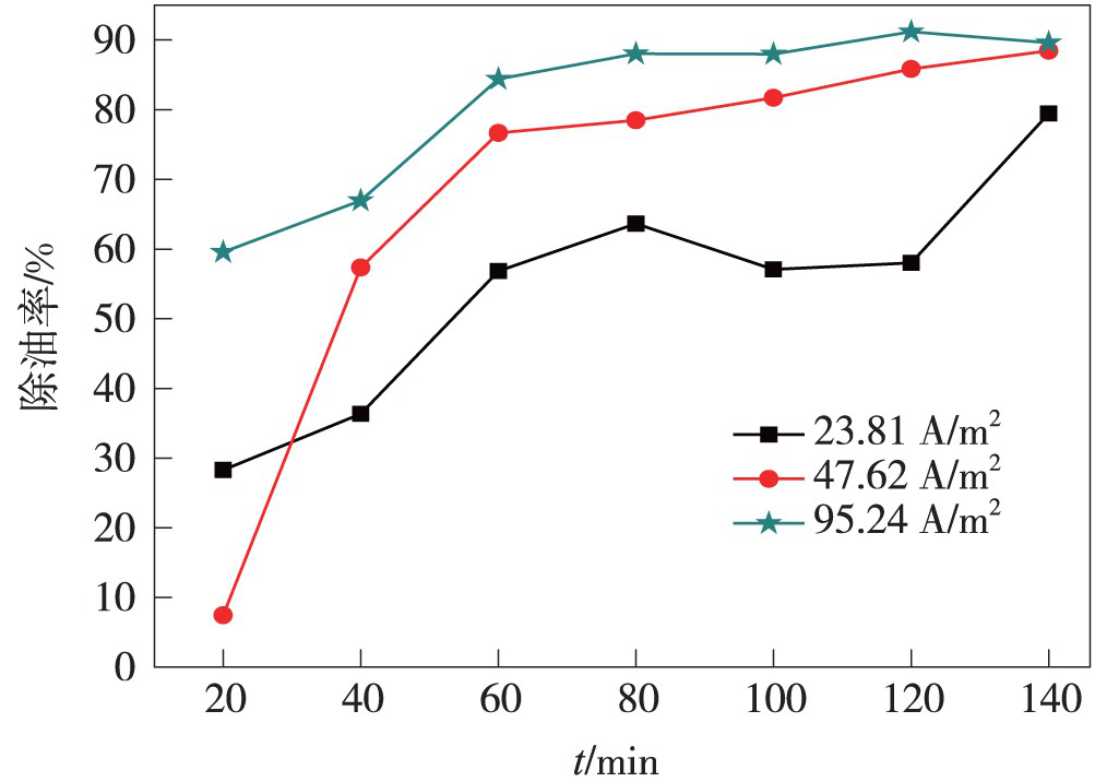 A/m2 時,電解50 min 即可達到穩態;且電流密度越大,達穩態時的處理效果越好,穩態時除油率達