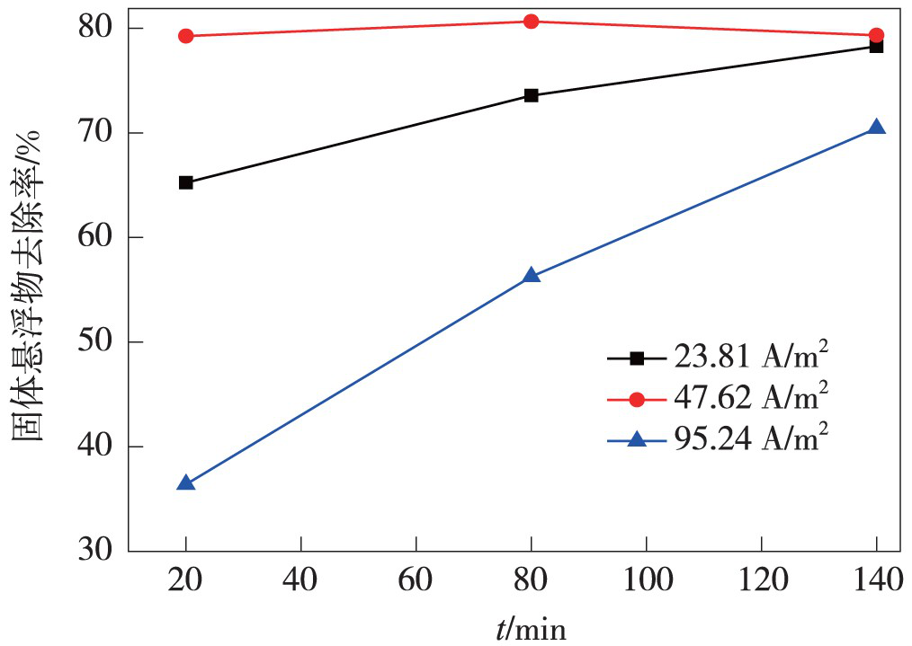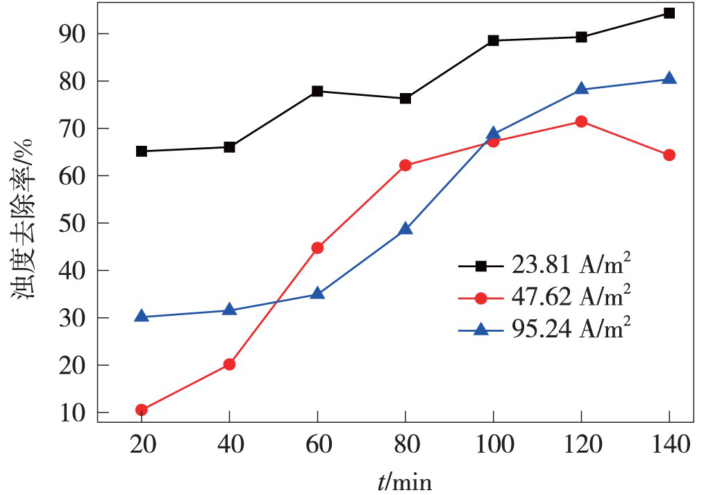 m2 時的處理效果,電流密度為47.62A/m2 時除油率顯著增加。當電流密度增大到95.24A/m2 時,電解前期除油率高于47.62A/m2 時的除油率,其余時間除油率基本持平。由圖13、圖14 可以看出,濁度去除率和固體懸浮物去除率隨著電流密度的升