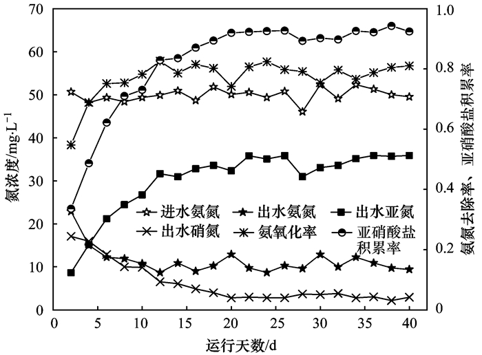 圖 2 運行期間氮素、氨氮去除率及亞硝酸鹽積累率變化