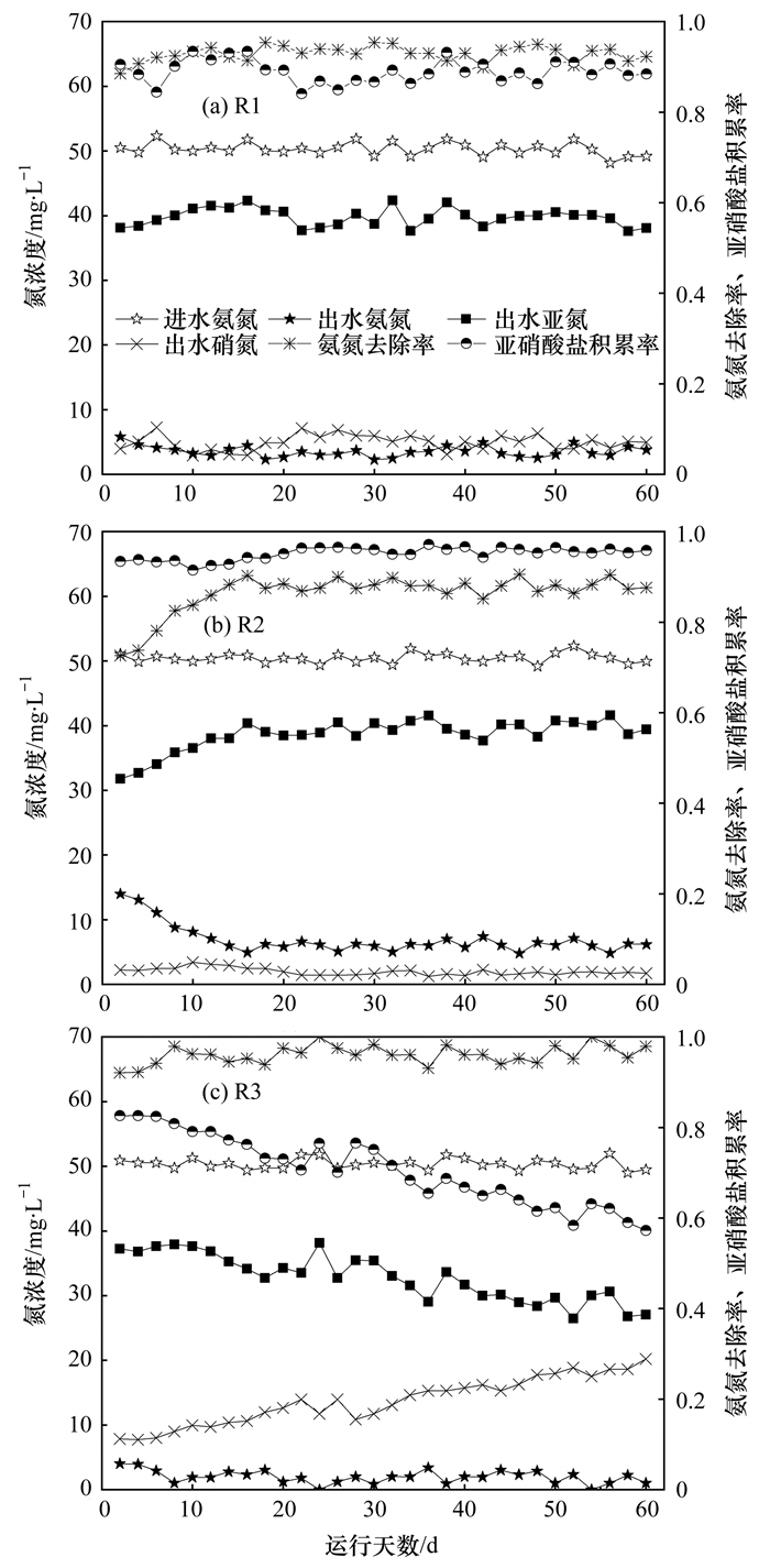 間歇曝氣在維持亞硝化性能方面至關重要, 厭氧時間對于NOB的抑制是積累亞硝酸鹽的關鍵, 為研究高頻曝氣下停曝時間組合對于亞硝化系統的影響, 采用3個SBR反應器(R1、R2和R3), 比較3種間歇曝氣方式為3 min:3 min、4 min:2 min及2 min:4 min對亞硝化系統穩定運行的影響, 反應器R1、R2和R3運行期間的亞硝化性能變化如圖 2所示.