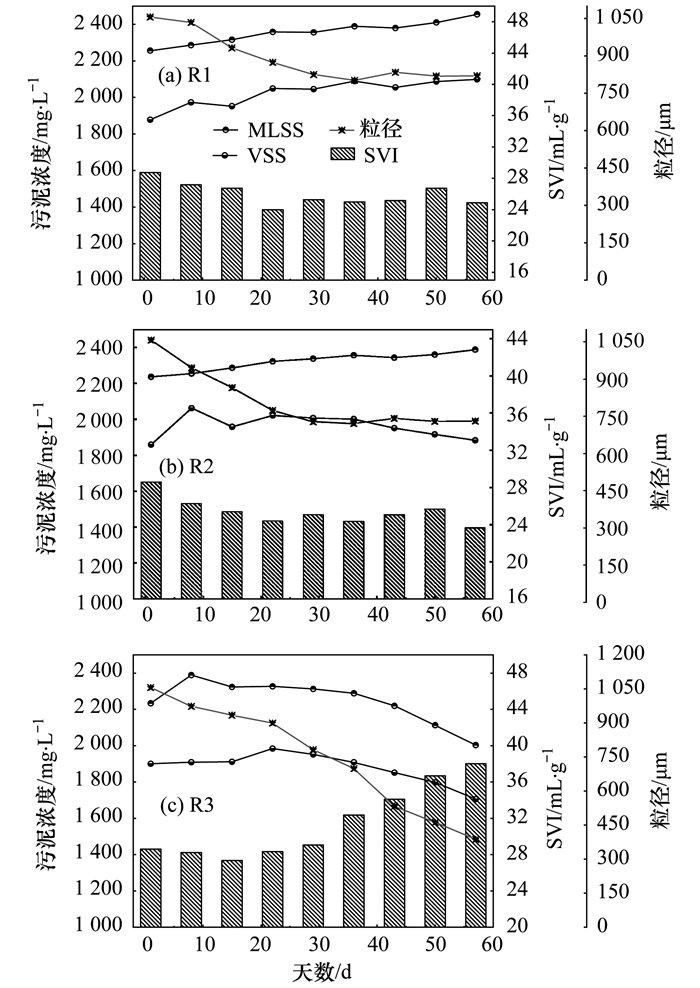 圖 3表征了整個實驗階段污泥沉降性能及平均顆粒粒徑的變化, 從中可知, R1、R2和R3這3個反應器中接種污泥后的MLSS分別為2 256、2 236和2 233 mg·L-1, SVI值分別為28.72、28.61和28.61mL·g-1, 說明污泥活性較高活性及沉降性能良好.由于硝化細菌為自養型細菌, 生長速率緩慢, 故R1、R2和R3的污泥濃度增加緩慢.從圖 3(a)和3(b)可以看出, 運行期間, R1和R2反應器的污泥濃度和污泥沉降性能均較好, 到22 d, R1和R2反應器中的污泥濃度分別增加到2 359 mg·L-1和2 322mg·L-1, SVI值分別下降到24.01mL·g-1和24.34mL·g-1, 并隨后基本保持穩定, 運行周期末, R1和R2反應器中的污泥濃度分別為2 455 mg·L-1和2 387 mg·L-1, SVI值分別為24.87mL·g-1和23.63mL·g-1.而與R1和R2不同的是, 由圖 3(c)可知, 對于R3反應器, 污泥濃度呈現先上升后下降的趨勢, 同樣SVI呈現先下降后上升的趨勢, 運行周期末, R3中的污泥濃度下降到2 003 mg·L-1, SVI值上升到38.01mL·g-1.分析原因, 有研究表明, 低溶解氧會引起污泥結構的不穩定, 在R3反應器中, 停曝時間過短, 厭氧好氧交替的環境不能完全實現, 致使其運行效果傾向于連續曝氣, 并且在停曝期間顆粒污泥處于低DO環境下, 致使污泥沉降性能變差, 并且反應器內沉降時間較短, 部分顆粒污泥解體, 污泥的流失, 故R3污泥濃度下降.而在R1和R2反應器內形成了交替厭氧/好氧的運行模式, 而這種運行方式將增加缺氧異養菌的生長速度, 使得缺氧異養細菌作為顆粒的核心, 這有利于顆粒污泥結構的穩定, 故R1和R2運行階段污泥沉降性能良好.