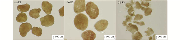 R1、R2和R3運行初期, 接種的顆粒污泥平均粒徑為1 056 μm, 為了減少較短的沉降時間對顆粒的選擇壓力的影響, 運行期間維持控制R1、R2和R3反應器的沉降時長為7 min.反應器內污泥的平均顆粒粒徑如圖 3所示.