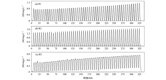 如圖 7和8所示, 分別為R1、R2和R3在運行期內的一個典型周期內氨氮、亞硝態氮、硝態氮和DO的變化.分析圖 7可知, R1、R2和R3的好氧段的DO分別在0.8~1.2、1.3~1.7和0.5~0.8mg·L-1之間變化, 由圖 7(a)和8(a)可以看出, R1反應器厭氧段DO接近于0 mg·L-1, R1進水氨氮為51.07mg·L-1, 周期末氨氮、亞硝態氮、硝態氮為5.88、39.13及4.87mg·L-1, 亞硝化性能良好.分析圖 8(b), R2初期進水氨氮為50.48mg·L-1, R2的周期出水氨氮、亞硝態氮、硝態氮為6.88、39.13及1.87mg·L-1, R2中的停曝時間為4 min, 較短的曝氣時間致使反應器內篩選出氨氧化率較快AOB菌, 并且較長時間的停曝時間使得NOB菌不能及時利用基質而受到了抑制, 故實現了良好的亞硝化性能及氨氮去除效果.由分析圖 8(c)可得, R3反應器進水氨氮為50.98mg·L-1, 周期末的氨氮、亞硝態氮及硝態氮為1.1、28.7和19.1mg·L-1, 與R1和R2不同的是, R3的氨氮去除率較高為97.8%, 但亞硝酸鹽積累率僅為60%, 分析原因, R3反應器的好氧段DO在0.5~0.8mg·L-1之間變化, 但厭氧段與R1和R2不同, 反應初期, 反應器處于好氧厭氧交替環境, 在第200 min后, 短的停曝時間導致DO并不能迅速降解為0, 致使反應后期停曝階段處于低DO狀態, 由于反應器中并未形成良好的厭氧好氧交替的環境, 隨著反應器運行天數的增加, 導致亞硝化顆粒污泥中的NOB菌得不到抑制, 相對活性得到了提高, 致使亞硝化系統遭到破壞.