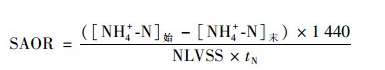 式中, [NH4+-N]始為硝化開始時反應器內的NH4+-N濃度(mg·L-1); [NH4+-N]末為硝化結束時反應器內的NH4+-N濃度(mg·L-1); MLVSS為反應器內的污泥質量濃度(mg·L-1); tN為硝化反應時間(min).