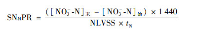 式中, [NO3--N]末為硝化結束后反應器內的NO3--N濃度(mg·L-1); [NO3--N]始為硝化開始時反應器內的NO3--N濃度(mg·L-1); MLVSS為反應器內的污泥質量濃度(mg·L-1); tN為硝化反應時間(min).