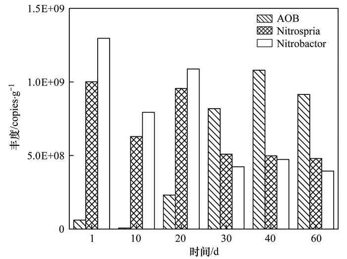 圖 2所示為硝化過程中添加剩余污泥堿性發(fā)酵混合物作為碳源的SBR反應器(F-SBR)在長期運行過程中好氧末氮轉化途徑, 系統(tǒng)在投加污泥發(fā)酵混合物作為碳源后, 硝化性能下降, 好氧末有NH4+-N剩余.在15 d后系統(tǒng)開始逐漸適應污泥發(fā)酵混合物的投加, 硝化活性開始逐漸恢復, 并且反應器內開始出現(xiàn)亞硝積累現(xiàn)象并維持穩(wěn)定, 穩(wěn)定后反應器內好氧末的平均亞硝積累率維持在87.4%.圖 3為反應器初始階段(Day1)、恢復階段(Day15)與短程硝化穩(wěn)定維持階段(Day43)的AOB和NOB活性進行對比, 可以發(fā)現(xiàn)AOB的活性已經得到了一定的恢復, NOB的活性則受到了明顯的抑制, 硝化過程中硝態(tài)氮積累率(NAR)由初始的73.03%降低至8.89%, 比硝態(tài)氮積累速率(SNaPR)由初始的0.179 1 g·(g·d)-1下降至0.007 8 g·(g·d)-1.圖 4為反應器內長期AOB和NOB種群豐度情況(以干污泥計), 反應器內投加污泥發(fā)酵物后AOB和NOB的豐度均呈現(xiàn)先下降后上升的趨勢, 反應器在適應污泥發(fā)酵物的投加后, AOB由6.08×107 copies·g-1增長至9.15×108 copies·g-1, 種群豐度上升; Nitrospria由1×109copies·g-1下降至4.79×108 copies·g-1, Nitrobacter由1.3×109 copies·g-1下降至3.94×108copies·g-1, NOB的基因拷貝數(shù)均下降一個數(shù)量級, 種群豐度下降.這也與反應器內的反應情況吻合, 系統(tǒng)在適應污泥發(fā)酵物的投加后AOB活性恢復且快速富集, 而NOB的活性則長期受到抑制, 種群豐度明顯下降.