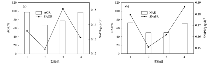 進一步考察不同污泥發(fā)酵產物對活性污泥系統(tǒng)硝化性能的影響, 分別考察系統(tǒng)內的氨氮氧化率、硝態(tài)氮積累率、比氨氧化速率、比硝態(tài)氮生成速率的變化情況(圖 6). 1組在未投加污泥發(fā)酵產物的情況下, 原始的AOR和SAOR(以N/VSS計)分別為97.29%和0.135 7 g·(g·d)-1, NAR和SNaPR分別為73.03%和0.179 3 g·(g·d)-1, AOB和NOB活性良好. 2~4實驗組污泥的AOR分別為67.34%、77.14%和97.26%, SAOR分別為0.123 6、0.151 0和0.131 0 g·(g·d)-1, 可以看出2組(投加發(fā)酵混合物)AOB的活性有所下降; 3組(投加發(fā)酵液)AOB的活性反而有所上升; 4組(投加發(fā)酵底泥)AOB的活性相較于原始污泥則沒有太大變化.污泥的NAR分別為49.47%、49.43%和71.34%, SNaPR分別為0.151 0、0.161 7和0.186 4 g·(g·d)-1, 可以看出2組(投加發(fā)酵混合物)和3組(投加發(fā)酵液)的實驗組中, 硝態(tài)氮積累率和比硝態(tài)氮積累速率都有了明顯的下降, NOB的活性受到了抑制, 而4組(投加發(fā)酵底泥)比硝態(tài)氮積累速率反而有所上升, 證明NOB的活性相比于其他實驗組有所提高.