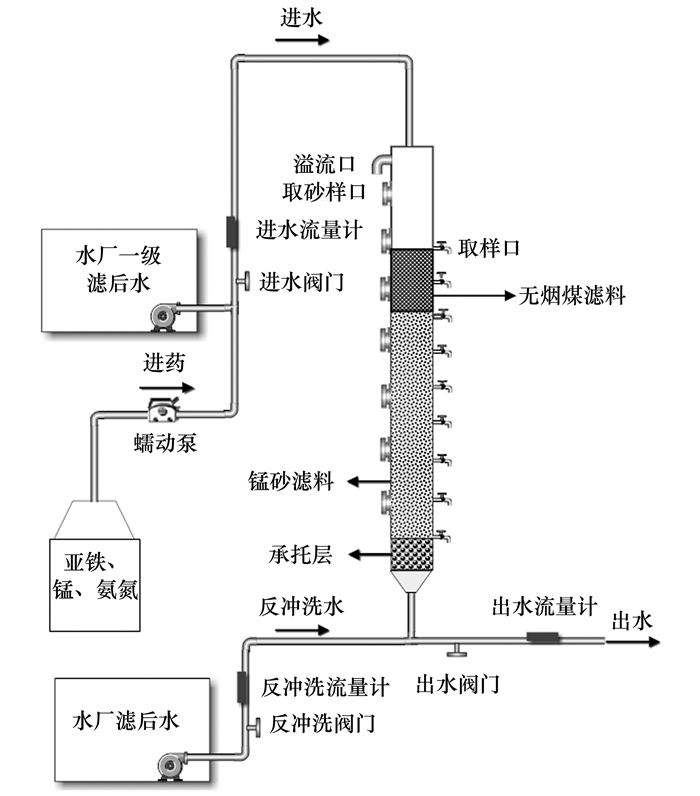 以水廠兩級(jí)生物凈化工藝中的一級(jí)濾池濾后水與硫酸亞鐵(FeSO4)、硫酸錳(MnSO4)及硫酸銨[(NH4)2SO4]配置成的混合液作為實(shí)驗(yàn)進(jìn)水.主要水質(zhì)指標(biāo)如下:水溫6~8℃, Fe(Ⅱ) 2.91~6.35 mg·L-1, Mn(Ⅱ) 0.47~0.98 mg·L-1, NH4+-N 1.15~2.26 mg·L-1, NO2--N痕量, NO3--N 0.07~0.34 mg·L-1, 高錳酸鹽指數(shù)痕量, pH為6~7, DO為8.3~10.0 mg·L-1.