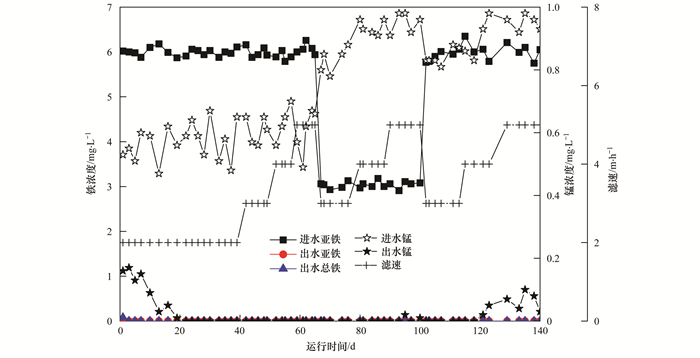 圖 2為運(yùn)行過(guò)程中鐵錳濃度變化情況.由于亞鐵在濾柱中主要是通過(guò)化學(xué)接觸氧化作用去除的, 所以濾柱在啟動(dòng)初期就表現(xiàn)出良好的除鐵性能, 在整個(gè)過(guò)程中濾柱的除鐵性能并未受濾速及濃度的影響, 出水總鐵均能滿足《生活飲用水衛(wèi)生標(biāo)準(zhǔn)》(GB 5749-2006)中的限值要求.而錳在濾柱中主要是通過(guò)生物作用去除的, 且有研究表明, 濾柱短期停運(yùn)對(duì)于生物濾層除錳效果的影響是輕微的, 正如圖 2所示在濾柱啟動(dòng)初期出水錳濃度不達(dá)標(biāo), 此后僅經(jīng)過(guò)10 d的培養(yǎng), 出水錳濃度便逐漸降低至0.09 mg·L-1, 此后出水錳濃度均能滿足標(biāo)準(zhǔn)中的限值要求, 生物除錳啟動(dòng)成功