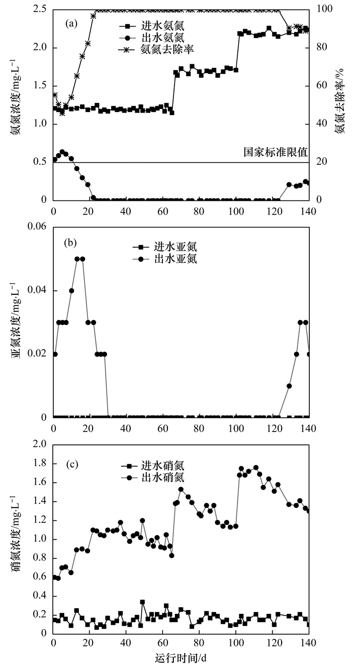 圖 3為運(yùn)行過(guò)程中進(jìn)出水“三氮”變化情況.由圖 3(a)知, 啟動(dòng)初期濾后水氨氮濃度首先升高, 造成此現(xiàn)象的原因是濾料具有物理吸附作用, 然而其吸附位是有限的, 故隨著運(yùn)行時(shí)間的延長(zhǎng), 濾料的吸附能力逐漸飽和, 濾柱對(duì)氨氮的吸附能力逐漸降低, 故濾柱在啟動(dòng)初期出水氨氮濃度表現(xiàn)出增加的趨勢(shì).由圖 3(b)知, 啟動(dòng)的前30 d, 出水亞氮濃度高于進(jìn)水, 表明濾柱中的AOB菌(氨氧化菌)活性或生物量強(qiáng)于NOB(亞硝酸鹽氧化菌)和AnAOB(厭氧氨氧化菌), 出水亞氮得到了積累.分析圖 3(c)可知, 在濾柱啟動(dòng)初期, 出水硝氮濃度明顯高于進(jìn)水硝氮濃度, 表明停運(yùn)1個(gè)月的生物濾柱經(jīng)過(guò)短時(shí)間培養(yǎng)后仍然具有較好的硝化性能, 隨著生物濾柱的培養(yǎng), 出水硝氮濃度逐漸升高.