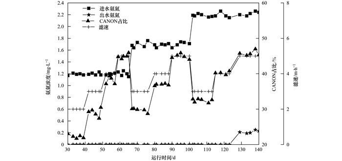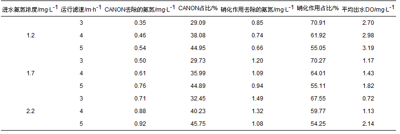 當(dāng)生物濾柱運(yùn)行至70 d時(shí), 進(jìn)水氨氮濃度為1.73 mg·L-1, 濾速為3 m·h-1, 出水氨氮濃度為0, 進(jìn)出水亞氮濃度均為0, 進(jìn)水硝氮濃度為0.26 mg·L-1, 出水硝氮濃度為1.53 mg·L-1, 故氨氮的去除量為1.73 mg·L-1, 硝氮變化量為1.27 mg·L-1, 氮素?fù)p失為0.46 mg·L-1, 由式(9)和(10)知, 經(jīng)CANON過(guò)程去除的氨氮約為0.52 mg·L-1, 約占氨氮去除量的29.88%, 經(jīng)硝化作用去除的氨氮約為1.21 mg·L-1, 約占氨氮去除量的70.12%.由圖 6可知, 當(dāng)進(jìn)水氨氮濃度平均為1.7 mg·L-1, 并以3 m·h-1的濾速運(yùn)行時(shí), 氨氮的平均去除量為1.7 mg·L-1, 經(jīng)CANON過(guò)程去除的氨氮平均約占氨氮去除量的29.73%, 約為0.50 mg·L-1, 故經(jīng)硝化作用去除的氨氮平均約占氨氮去除量的70.27%, 約為1.20 mg·L-1; 當(dāng)濾速提升至4 m·h-1時(shí), 氨氮的平均去除量為1.7 mg·L-1, CANON作用去除的氨氮平均約占氨氮去除量的35.99%, 約為0.61 mg·L-1, 故經(jīng)硝化作用去除的氨氮平均約占氨氮去除量的64.01%, 約為1.09 mg·L-1; 繼續(xù)提升濾速至5 m·h-1, 氨氮的平均去除量仍為1.7 mg·L-1, 經(jīng)CANON作用去除的氨氮平均約占氨氮去除量的44.89%, 約為0.76 mg·L-1, 故經(jīng)硝化作用去除的氨氮平均約占氨氮去除量的55.11%, 約為0.94 mg·L-1.由此知, 當(dāng)進(jìn)水氨氮濃度平均為1.7 mg·L-1時(shí), 提升濾速會(huì)導(dǎo)致通過(guò)CANON作用去除的氨氮及比例增加, 而通過(guò)硝化作用去除的氨氮及比例降低.