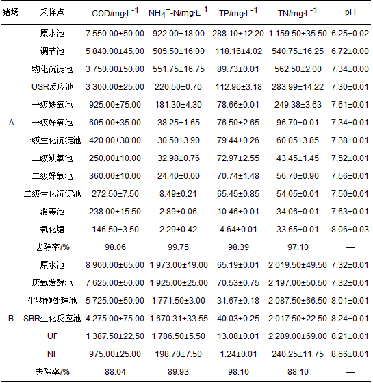 2家規模化養豬場廢水處理工藝各處理單元對常規水質指標的削減情況如表 2所示.豬場A和豬場B的廢水處理工藝對廢水中常規污染物(COD、NH4+-N、TN和TP)的去除率分別為97.10% ~99.75%和88.10% ~98.10%.整體而言, 對廢水中COD的去除, 豬場A優于豬場B;在豬場A的USR反應池中對COD的去除貢獻最大, 豬場B廢水處理中生物預處理池、SBR生化反應池及UF處理單元對COD的去除效果較好.在豬場B中, NH4+-N和TN僅在NF處理單元被有效去除, 這可能是由于納濾膜孔徑和膜表面電荷的共同作用.在豬場A的USR反應池TP的濃度高于上一級處理單元, 這可能是因為USR反應池處于厭氧環境, 聚磷菌會在此環境下打開體內聚合磷酸鹽的高能磷酸鍵, 從而釋放出磷, 使得USR反應池中磷酸鹽濃度增加.在豬場A的出水中COD、NH4+-N、TN和TP的濃度均滿足《畜禽養殖業污染物排放標準》(GB 18596-2001)的要求;在豬場B的出水中僅TP指標滿足GB 18596-2001的要求, 其余3項指標均超標, 故仍需進行后續處理.綜上, 豬場A廢水處理工藝對廢水中常規污染物的去除效果優于豬場B.