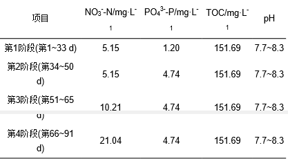 本研究所用廢水為模擬龜鱉養殖廢水, 海水取自山東省威海市環翠區小石島, 分別以硝酸鈉(NaNO3)、磷酸二氫鉀(KH2PO4)和葡萄糖(C6H12O6)作為污染物質的N、P、C源, 并加入碳酸氫鈉(NaHCO3)調節pH在7.5~8.5范圍內, 運行過程中具體水質參數如表 1所示.