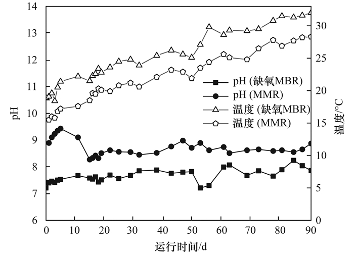 圖 3 缺氧MBR-MMR系統溫度和pH變化