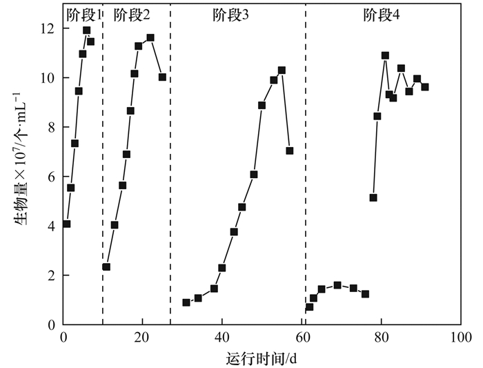在反應器運行的91 d時間內, 對MMR內普通小球藻的生長情況進行了持續監測, 結果如圖 4所示.根據采收情況將運行階段分成階段1~4, 分別在運行的第10、27和61 d進行了采收, 在階段4中, 可能是由于啟動階段微藻濃度太低, 導致了微藻持續培養生物量上升較慢, 并在68 d后出現了下降情況.在前3個階段運行的基礎上得到微藻最高濃度大約在12×107個·mL-1, 并且在(2~10)×107個·mL-1濃度范圍內生物量增長最快, 因此從運行的第79 d開始, 在生長對數期以5×107個·mL-1的濃度啟動反應器, 并且以每天定時采收1 L的方式進行連續采收, 能較好地將濃度維持在9×107個·mL-1附近, 實現高效且穩定的采收和污染物的去除效果.