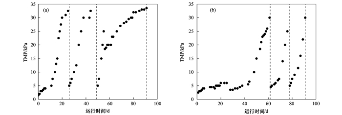 (a)缺氧MBR的TMP變化; (b)MMR的TMP變化