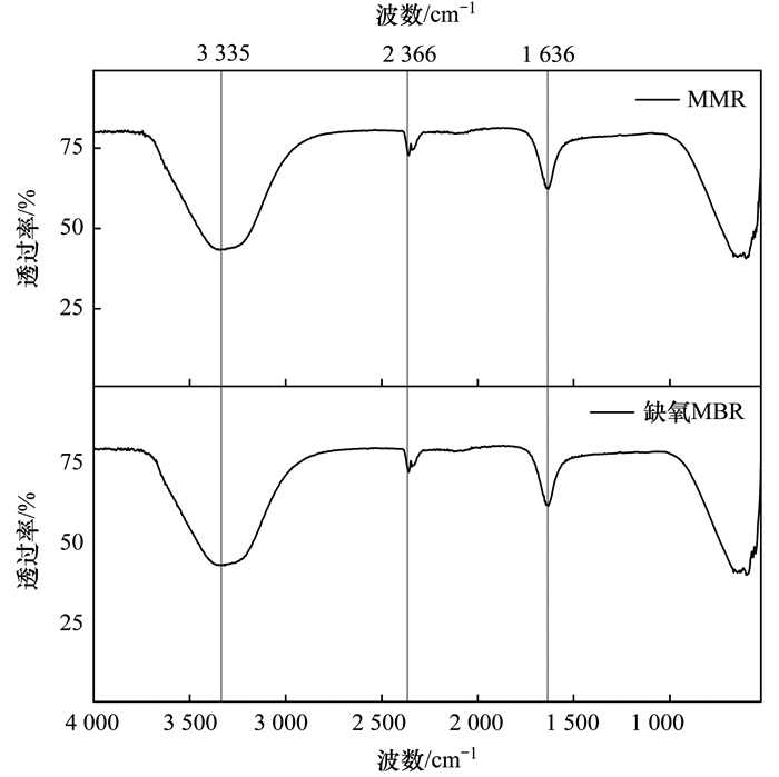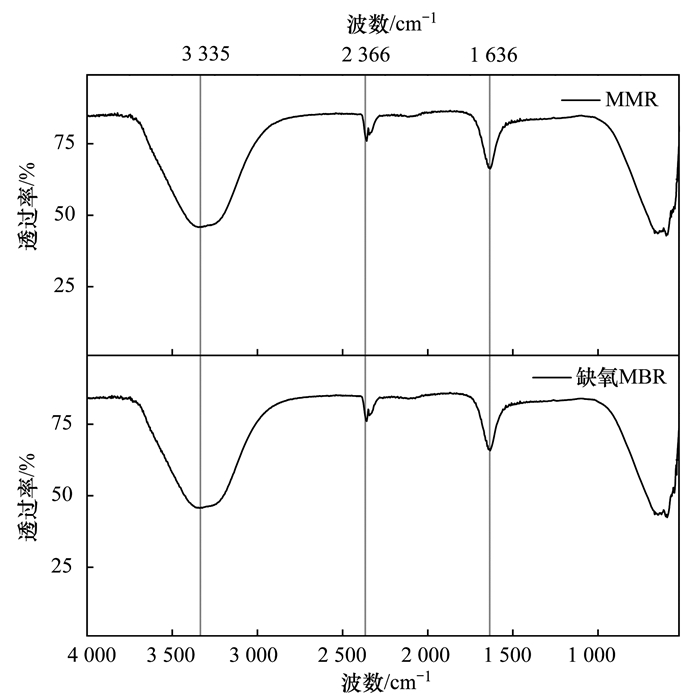 SMP呈現出與EPS相似的紅外光譜特性, 出峰位置為3 335、2 366和1 636 cm-1附近(圖 9), 并且對于缺氧MBR內膜表面濾餅層來說, 相較于運行中期階段, 運行末期也在2 366 cm-1附近出現N≡N伸縮振動.
