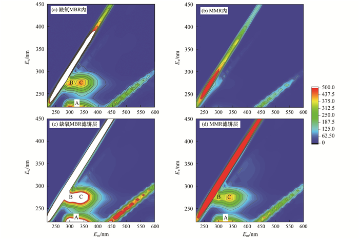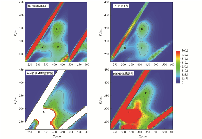 如圖 10所示, SMP的熒光特性表明缺氧MBR與MMR內混合液的譜圖相似, 出峰位置大致相同, 對比相關資料可知, 反應器內SMP均含有色氨酸類物質(B峰)和腐殖酸類物質(峰D、峰E).對比與腐殖酸類物質相關的峰強, 缺氧MBR均高于MMR, 這與缺氧MBR內膜污染較嚴重的事實相符.