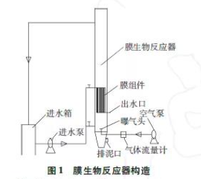 實驗裝置采用一體式膜生物反應器,見圖1,反應器為圓形有機玻璃柱,有效容積為25 L,原水從底部進入生物反應器內(nèi),經(jīng)抽吸泵膜組件過濾出水。膜組件為中空纖維膜( 孔徑為0. 1 ~ 0. 2 μm,膜面積為0. 2 m2 ) ,放置在反應器中部。反應器下方設有穿孔曝氣管,以轉子流量計調節(jié)曝氣量,一方面為微生物降解有機物好氧段提供必要的溶解氧,另一方面可將污染物及活性成分污泥攪拌混合,并在膜表面形成一定的紊流,減緩膜污染。