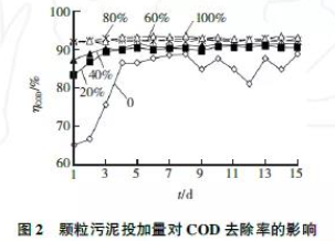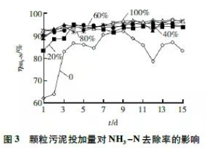 由圖4 可知,無顆粒污泥時,苯酚的去除率波動很大,去除率在96. 33%~ 99. 09%; 有顆粒污泥存在時,苯酚的去除率都在99%以上,平均為99.90%。由此可知,加入顆粒污泥可增強反應器對苯酚的去除效果,并且加入顆粒污泥的量對苯酚的去除率影響不大。苯酚是一種有毒物質,對活性污泥生長具有一定的抑制作用,而顆粒污泥中具有豐富的生物相,可以保證苯酚的去除效果。