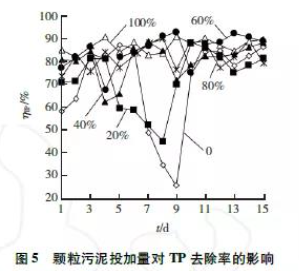 如圖5 可知,無顆粒污泥時TP 的去除率波動很大,特別是在6~ 9 d 時去除率較低。第9 d 去除率僅為25. 78%,第10 d 趨于穩(wěn)定,最高去除率為85. 65%,平均去除率只有69. 38%。投加顆粒污泥后TP 去除率的波動有所減少,并隨著顆粒污泥質量分數(shù)的增加TP 去除率波動顯著降低。顆粒污泥質量分數(shù)為100%時,TP 去除率在80% ~ 90%之間波動,平均去除率為85. 22%。這說明不同顆粒污泥質量分數(shù)對磷的去除效果不同,隨著顆粒污泥質量分數(shù)的增加而增強,且出水更穩(wěn)定。由于運行期間不排泥,TP 的去除效果主要靠膜的截留作用。投加顆粒污泥的質量分數(shù)不同,膜外表面形成的污泥層不同,去磷效果也不同。