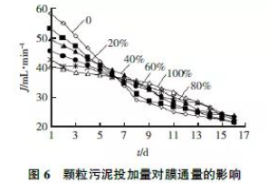 如圖6 所示,無顆粒污泥時,運行后膜通量由58 降到21. 3 mL /min,膜外表面凝膠層形成較快,膜通量迅速下降。后期由于凝膠層形成基本穩(wěn)定,通水量下降有所減少,膜通量衰減率為63. 3%。投入顆粒污泥后膜通量的衰減率逐漸減低,顆粒污泥質量分數(shù)為100%時膜通量衰減率降低到42. 8%,運行開始時由于形成的凝膠層空隙率大,使得傳質阻力較小,膜通量下降較慢。后期由于傳質壓力使得凝膠層逐漸致密,阻礙傳質,使膜通量下降速度相對升高,但已經(jīng)很好的緩解了膜污染現(xiàn)象。