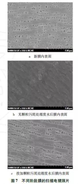 為了直觀的觀測膜污染情況,描電鏡觀察新膜內(nèi)表面、無顆粒污泥與投加顆粒污泥在運行周期結束后的膜表面,見圖7。