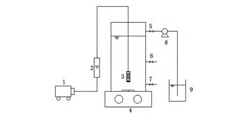 1-曝氣泵; 2-氣體流量計(jì); 3-曝氣頭; 4-磁力攪拌器; 5-進(jìn)水口; 6-出水口; 7-排泥口; 8-蠕動(dòng)泵; 9-進(jìn)水箱