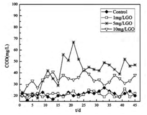 各反應(yīng)器出水中COD 濃度如圖2 所示。進(jìn)水 COD 約為 400mg / L,在45d 的運(yùn)行時(shí)間里,控制組的 COD 平均去除率達(dá)到95.1%。1mg / L GO 對(duì)COD 的去除影響并不明顯; 在 11d 時(shí),5mg / L GO 組的出水 COD 上升到 42mg / L,去除率下降到 89.5%; 在21d 時(shí),出水COD 達(dá)到最高,濃度為 67mg / L,去除率下降到 83.3%; 21d 后,出水COD 濃度有所下降,但平均去除率仍在89% 以下。10mg / L GO組的出水COD 高于控制組,最高時(shí)達(dá)到43mg / L,去除率為89. 3%。