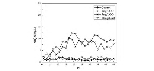 4 個(gè)反應(yīng)器中出水氨氮的濃度如圖 3 所示。進(jìn)水氨氮約為25mg / L,控制組的氨氮濃度去除率達(dá)到95. 1%,1mg / L GO 組的出水氨氮濃度與控制組的區(qū)別不大,在23d 后略高于控制組。5mg / L GO 與10mg / LGO 對(duì)氨氮的去除有明顯的抑制,在29d 前,10mg / L GO 的出水氨氮濃度高于5mg / LGO 組,隨后氨氮濃度有所下降并趨于平穩(wěn),而5mg / L GO 在29d 后的氨氮濃度高于10mg / L GO。在出水氨氮趨于平穩(wěn)后,5mg / LGO 組的氨氮平均去除率下降到70.5%,10mg / L GO 組的平均去除率為70.2%。