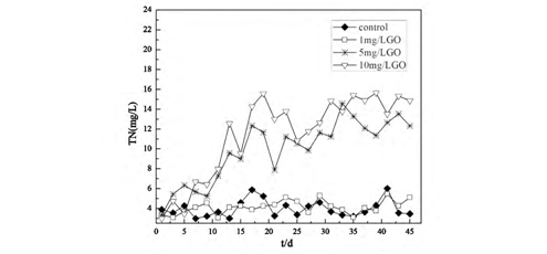 各反應(yīng)器總氮濃度如圖 4 所示。為期45d 的實(shí)驗(yàn)期間,控制組與1mg / L GO 組的總氮去除率區(qū)別不大,平均去除率分別為 84.1%和 83.4%。實(shí)驗(yàn)開始后,5mg / LGO 組與10mg / LGO 組的出水總氮濃度逐漸上升,并在17d 左右開始趨于穩(wěn)定,且10mg / LGO 對(duì)總氮去除的抑制程度高于5mg / LGO。二者在45d 內(nèi)的總氮平均去除率分別下降至60.3%和54.1%。這一結(jié)果說明,GO 對(duì)脫氮細(xì)菌的生物活性存在抑制作用。