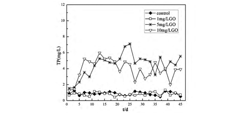 4 個(gè)反應(yīng)器中出水 TP 濃度如圖 5 所示,進(jìn)水 TP 約為 10mg / L,控制組與 1mg / L GO 組的總磷去除率均在 90%以上,說明低濃度 GO 對(duì)總磷的去除并無顯著影響。5mg / L GO 組的出水 TP 濃度最高達(dá)到 7. 11mg /L,去除率下降 28.9%,10mg / L GO 組的出水 TP 濃度最高達(dá)到 5.98mg / L,去除率為 40.2%。由數(shù)據(jù)可知,GO長(zhǎng)期暴露后,5mg / L GO 對(duì)總磷去除的抑制程度要略高于 10mg / L GO。GO 對(duì)除磷效率的抑制可能是由于其對(duì)活性污泥中除磷相關(guān)細(xì)菌活性的抑制,也有可能是由于微生物細(xì)胞因 GO 的毒性而破裂,使內(nèi)容物外泄從而導(dǎo)致總磷升高。