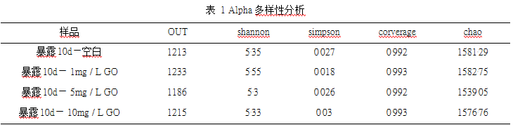本文列舉了具有代表性的 OUT、shannon、simpson、coverage、chao 指數(shù)。shannon 指數(shù)越大,simpson 指數(shù)越小,說明樣品生物多樣性越高; Chao 指數(shù)越高,表明群落豐度越高; coverage 數(shù)值越高,則樣本中序列被測(cè)出的概率越高。如表 1 所示,GO 短期暴露的4 個(gè)樣品中,5mg / L GO 的 OTU 數(shù)量最低,而1mg / L GO 與 10mg / L GO 的OTU 數(shù)與空白組相差不大。短期暴露的 4 組樣品中,5mg / L GO 的多樣性最低,物種豐度也較其他 3 組更低。而1mg / L GO 的多樣性比空白組更高,可能是由于低濃度 GO 對(duì)微生物有促進(jìn)作用。