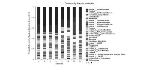 長(zhǎng)期暴露的4 組樣品多樣性與物種豐度普遍低于短期暴露的樣品,其原因可能是實(shí)驗(yàn)室的配水與實(shí)際污水相比過于單一。但不同濃度的 GO 仍然對(duì)活性污泥的多樣性產(chǎn)生了不同的影響。與短期暴露時(shí)相同,5mg / L 的 OTU 數(shù)最低( 776) ,比空白組( 992) 降低了約 20%,1mg / L GO( 791) 與10mg / L GO( 794) 的 OTU 數(shù)也都低于空白組。4 組樣品中,5mg / L GO 的 shannon、chao 指數(shù)最低,simpson 指數(shù)最高,物種多樣性與群落豐度最低?偟膩碚f,5mg / L GO 對(duì)物種多樣性的負(fù)面影響最大,而1mg / L GO 在短期暴露時(shí)會(huì)增加物種多樣性。